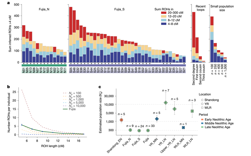 进一步研究发现傅家群体所有个体均存在显著的纯合性片段(ROH)特征,其总长度主要由4-20 cM的中短片段构成(下图)。这种ROH分布模式与小规模群体的遗传瓶颈效应高度吻合。值得关注的是,该群体的有效种群规模(Ne)估算值仅为200-400人,较同期东亚群体低2-3个数量级。结合山东地区密集的考古遗址分布可知,这种遗传隔离并非源于地理限制,而是特定社会文化因素作用的结果。进一步分析发现,仅4例个体携带超过100 cM的长ROH片段(提示三代内近亲婚配),而47%个体存在20-100 cM的中长ROH,符合二/三代表亲通婚模式。整体ROH的分布特征并不支持傅家群体内部存在频繁的近亲婚配,而更可能反映出在地理范围相对接近的若干群体之间长期保持婚姻联系所导致的遗传积累。从氏族制度的视角切入,傅家群体的遗传特征与母系社会普遍施行的氏族外婚制一致。根据对现代全球各地的母系社会的观察,不论生前是实行从母居(matrilocality)、走婚制(duolocality)或者从舅居(avunculocality),如果墓葬为母系氏族墓葬,男性死后普遍都埋葬到自己出身的母系氏族墓地。傅家遗址的遗传数据为这一理论在中国新石器时代的适用性提供了重要实证。