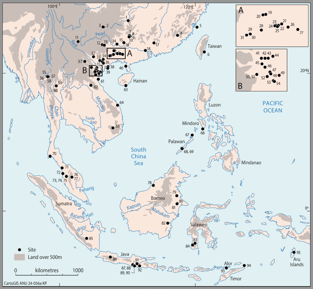 华南与东南亚晚更新世至中全新世屈肢葬/蹲踞葬遗址分布图
